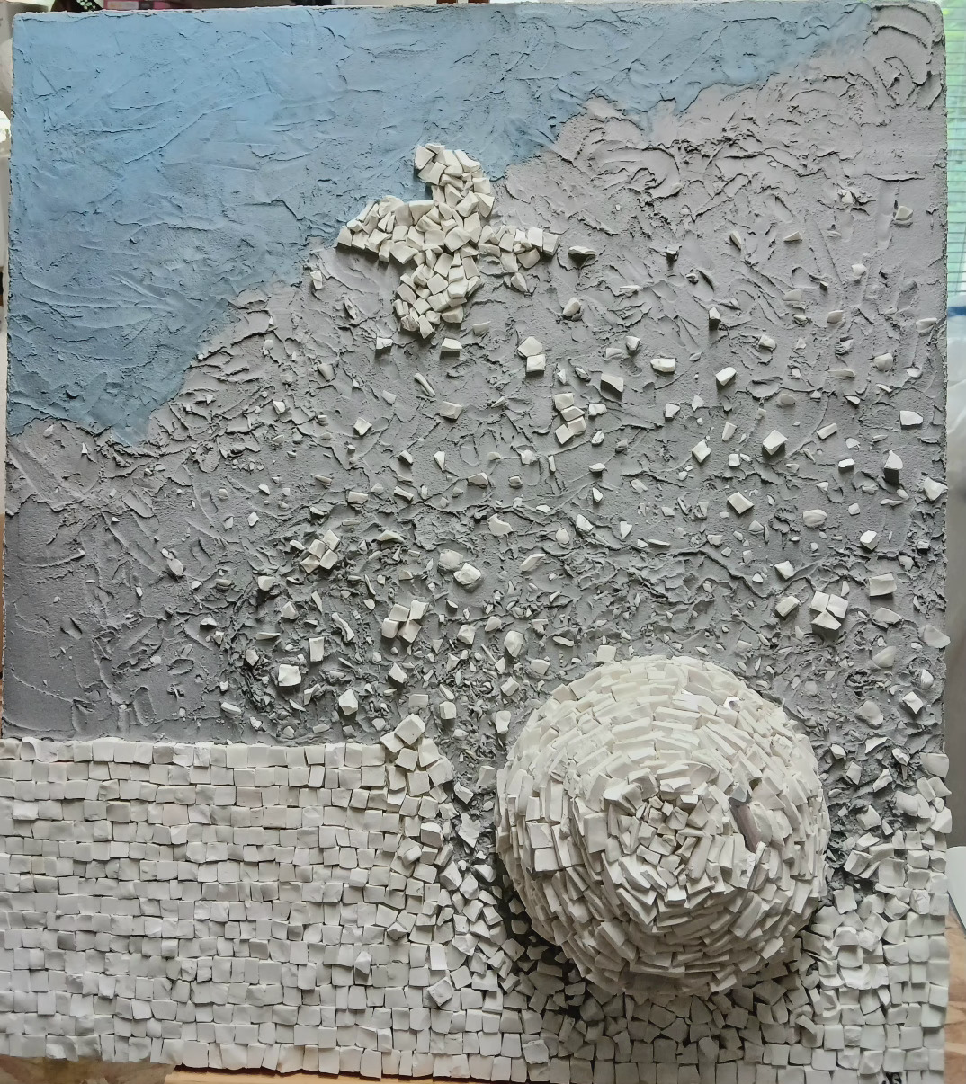 Je n’ai pas de thème fétiche, tout m’inspire : la nature, les portraits, les traditions de ma région (la Camargue), le monde de la Romanité…j’aime jouer avec les matériaux et je n’ai aucun a priori : cela peut être les matériaux manufacturés, les matériaux nobles comme les pierres naturelles, les marbres, les smalti, les verres et les matériaux que la nature nous offre comme le bois, les galets, les simples cailloux, les coquillages…